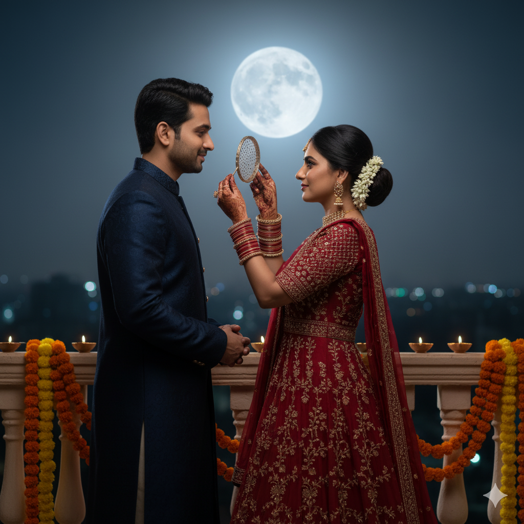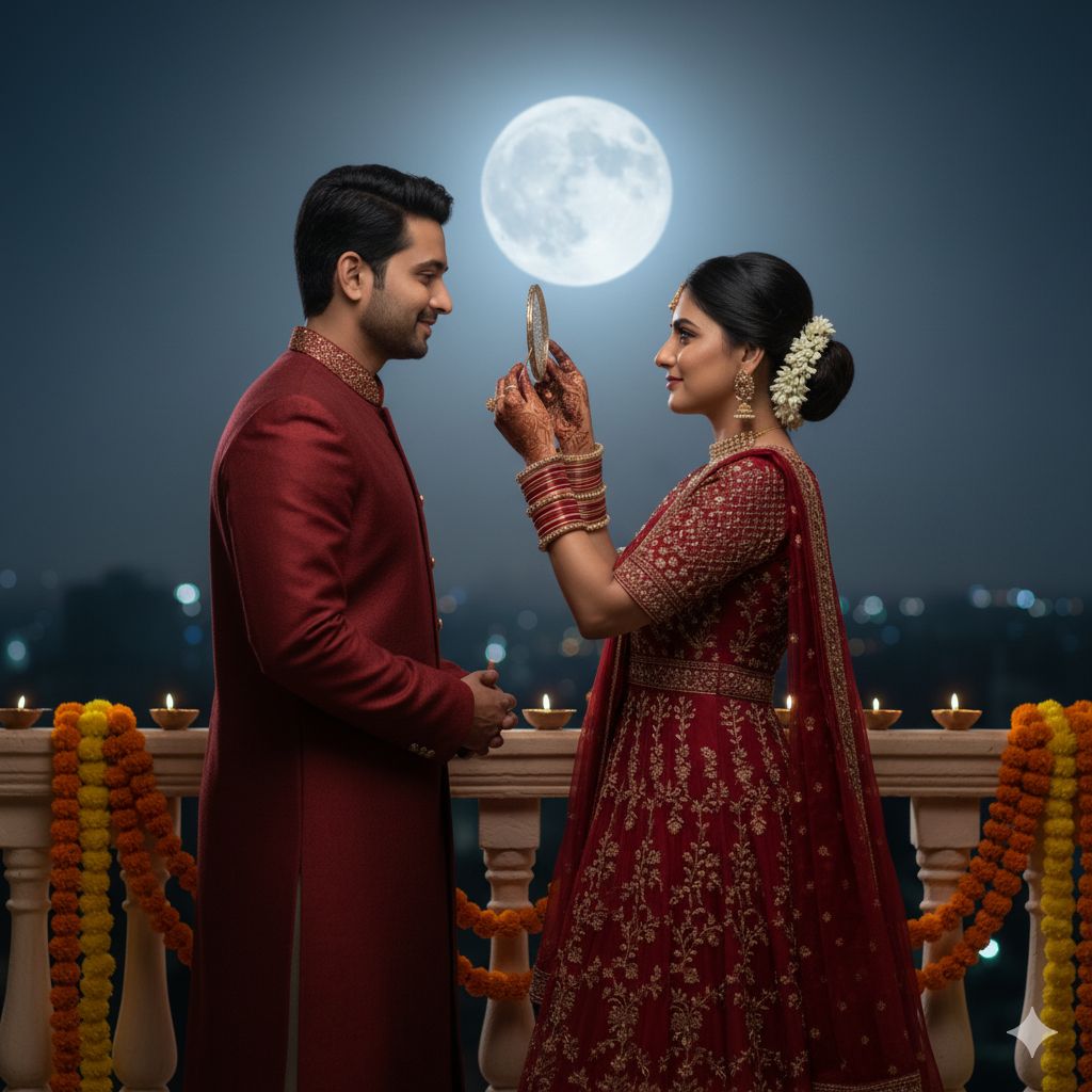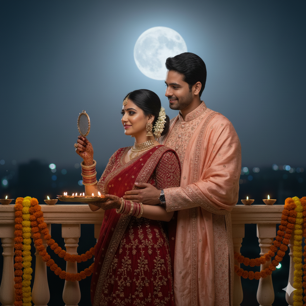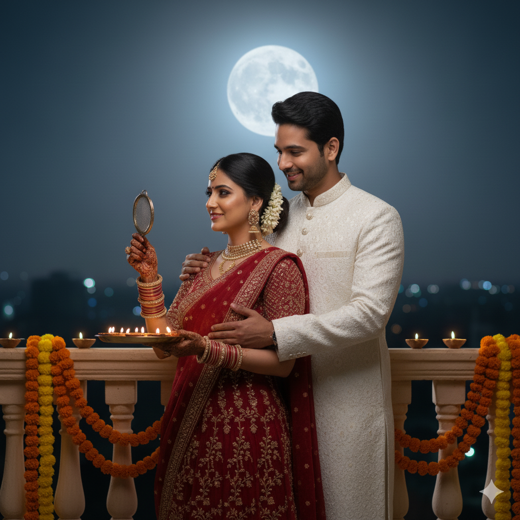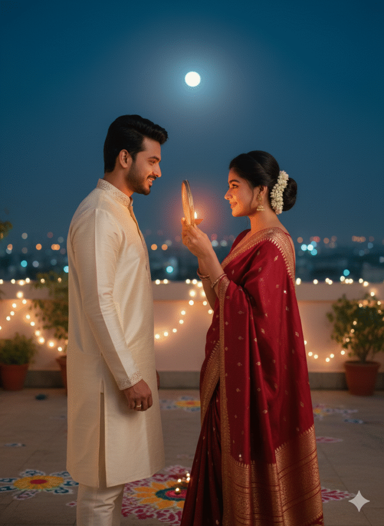 “Ultra-realistic cinematic image of couple, wife in red bridal saree with golden jewellery and floral hair, holding decorated thali with diya and sieve, husband in cream sherwani smiling at her, carved temple-style background under glowing crescent moon, 4k stunning detail.”