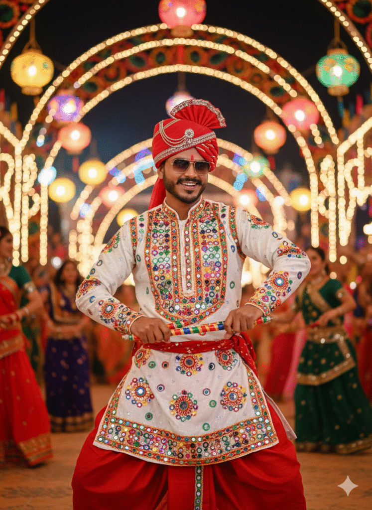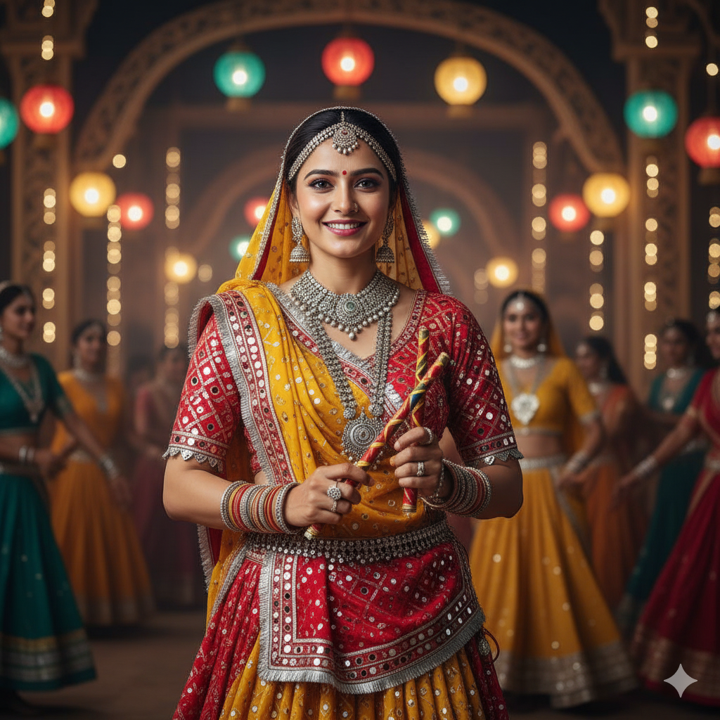 - “Traditional Gujarati garba look, vibrant ghagra choli, mirror work, colorful background, festive vibe, sharp details, no distortion.”