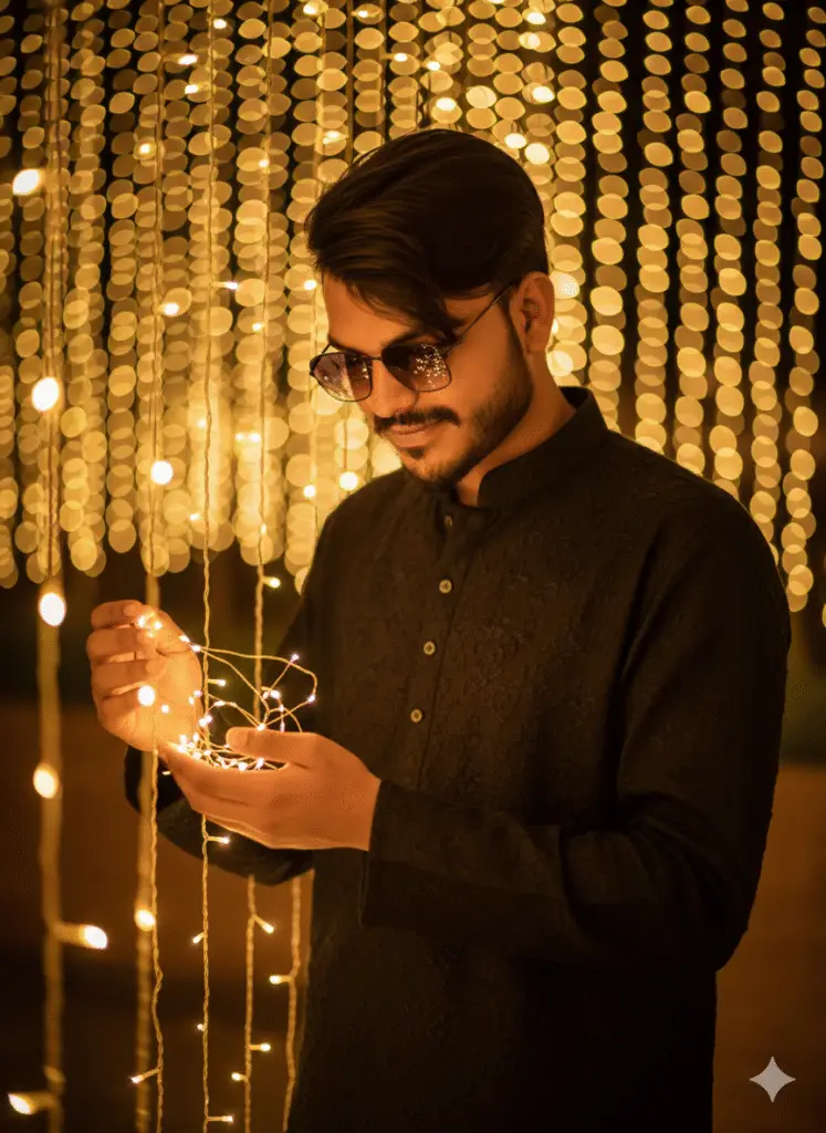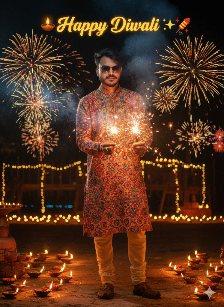 - “Create a portrait of a young Indian boy in traditional kurta-pajama, surrounded by glowing diyas and sparklers, cinematic background.”
