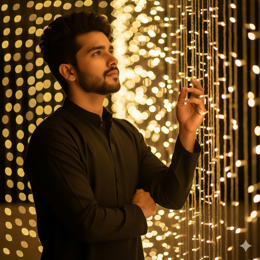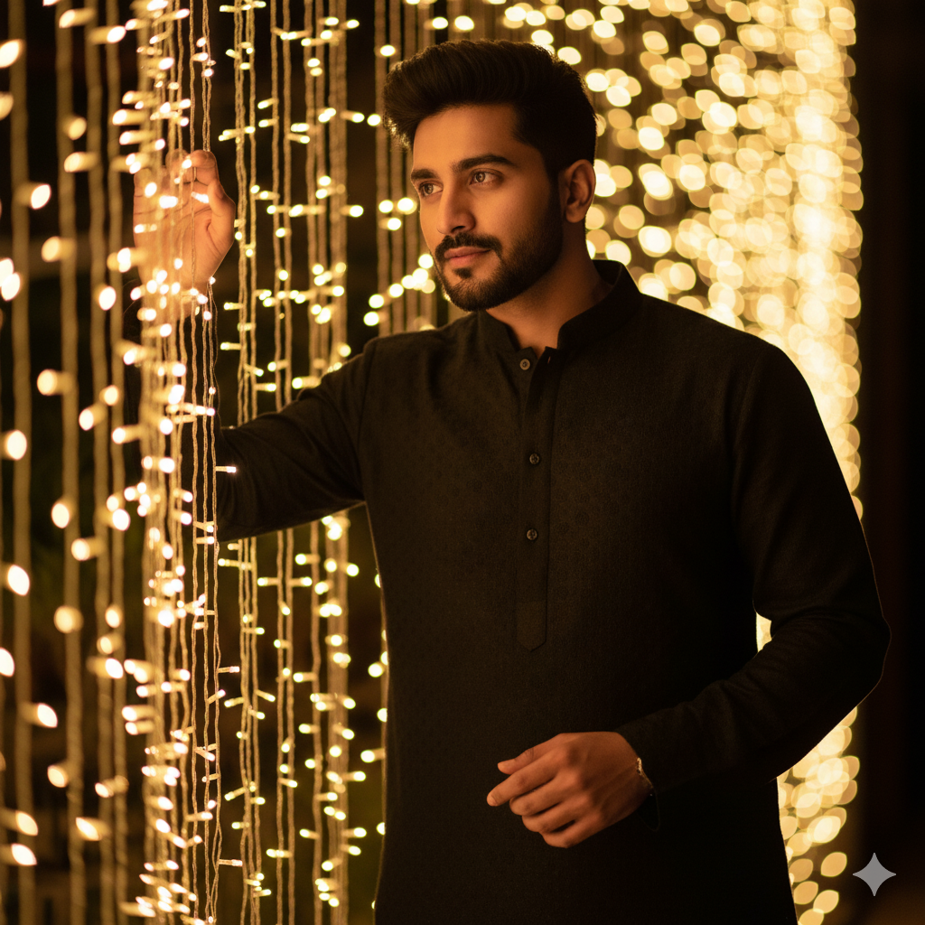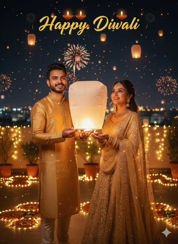 - “Stylish retro look with sherwani, holding a lantern, Diwali night sky filled with fireworks.”