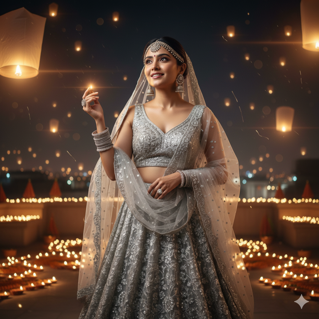 - “Diwali night portrait of a girl in lehenga choli, holding a decorated thali with diyas.”