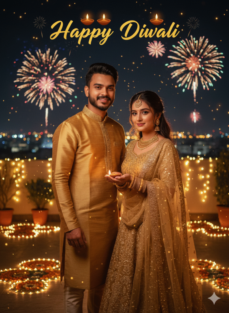 - “Indian couple holding sparklers, dressed in coordinated outfits, Diwali decorated background.”