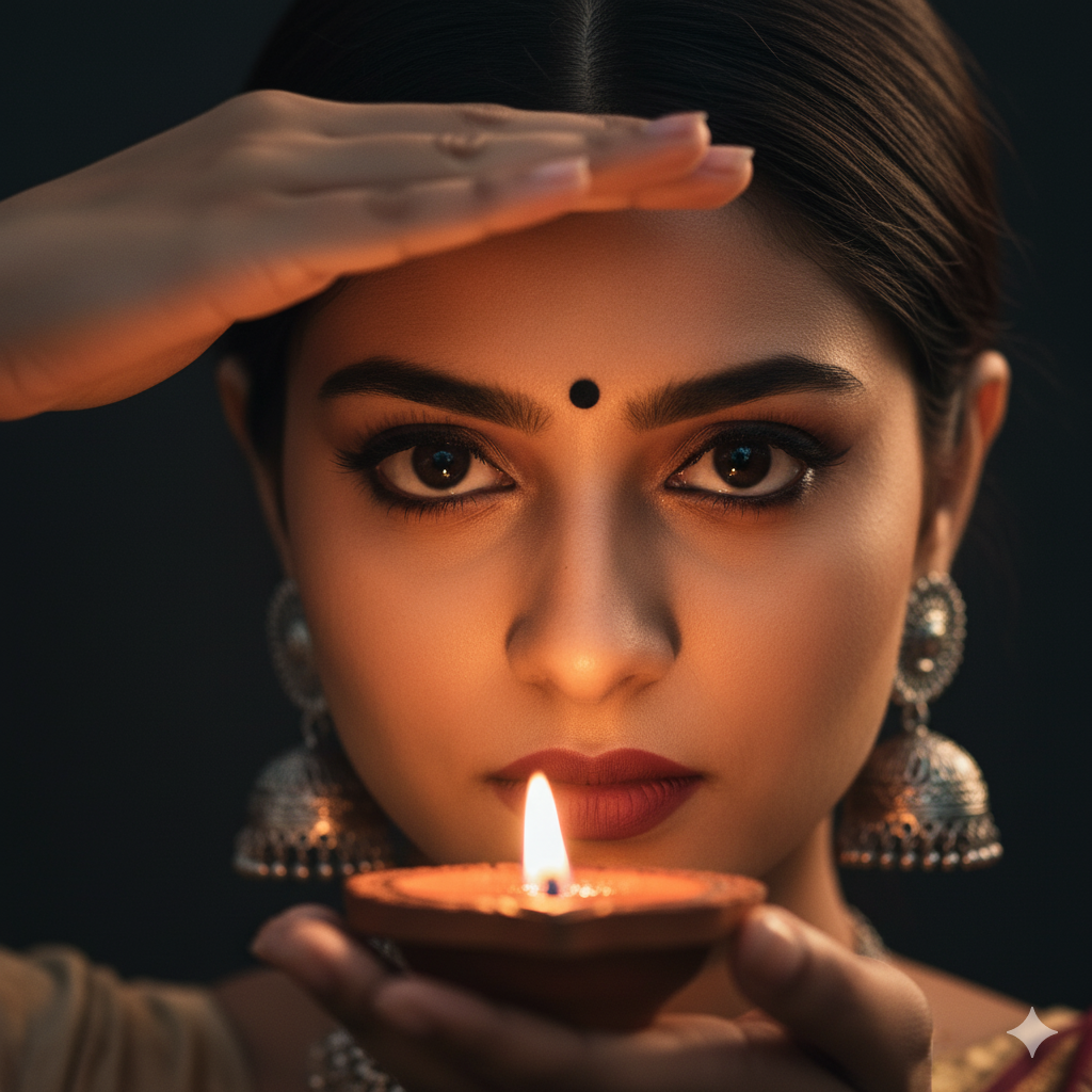 - “Close-up portrait with bindi, jhumkas, Diwali lamps in soft-focus background.”