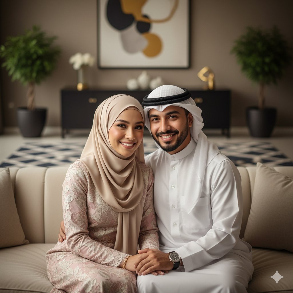 - “Trendy Muslim couple selfie, Instagram reel format, DSLR look.”