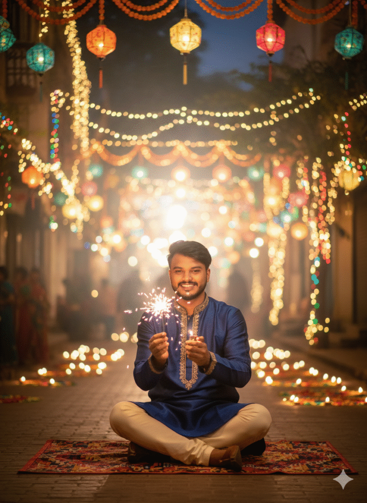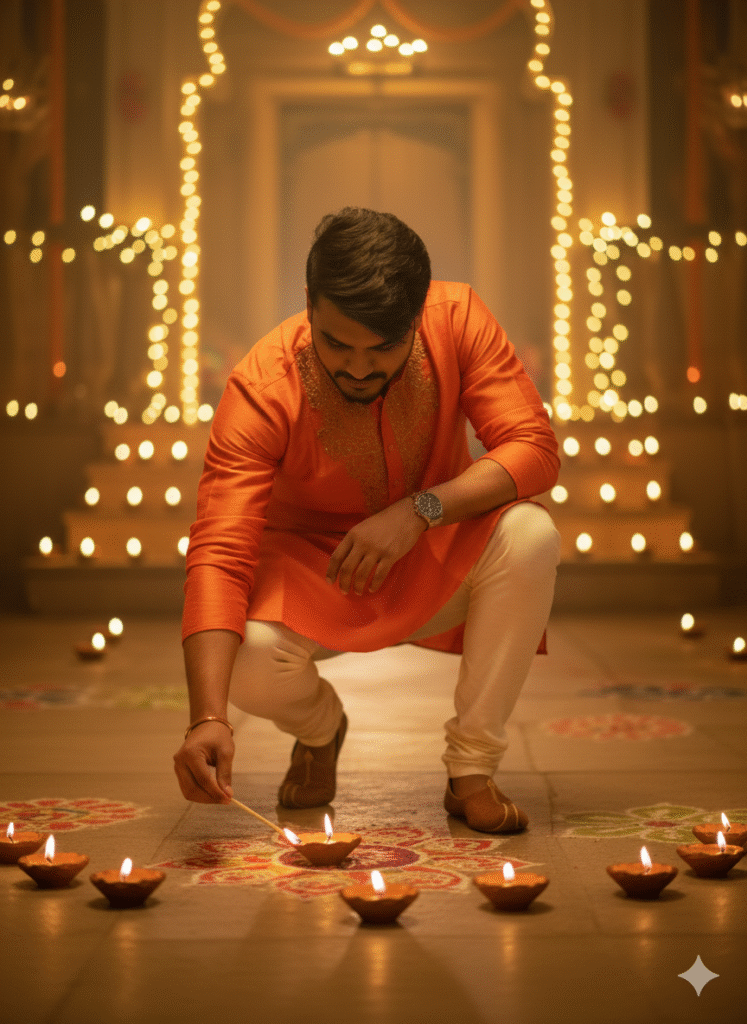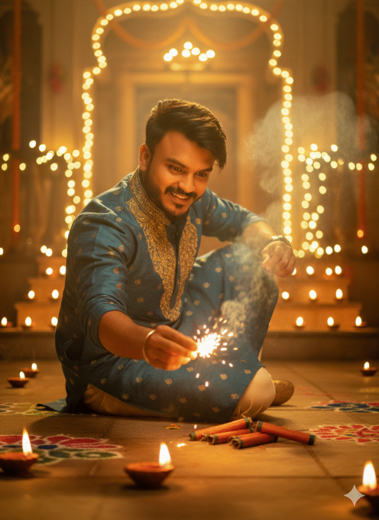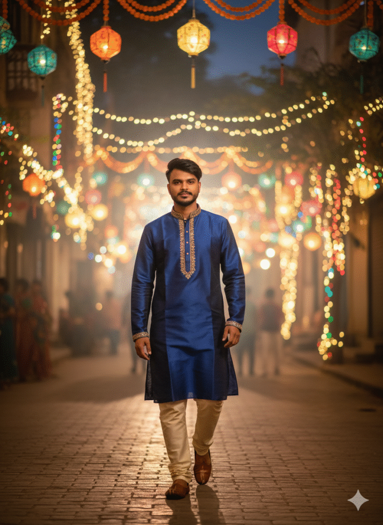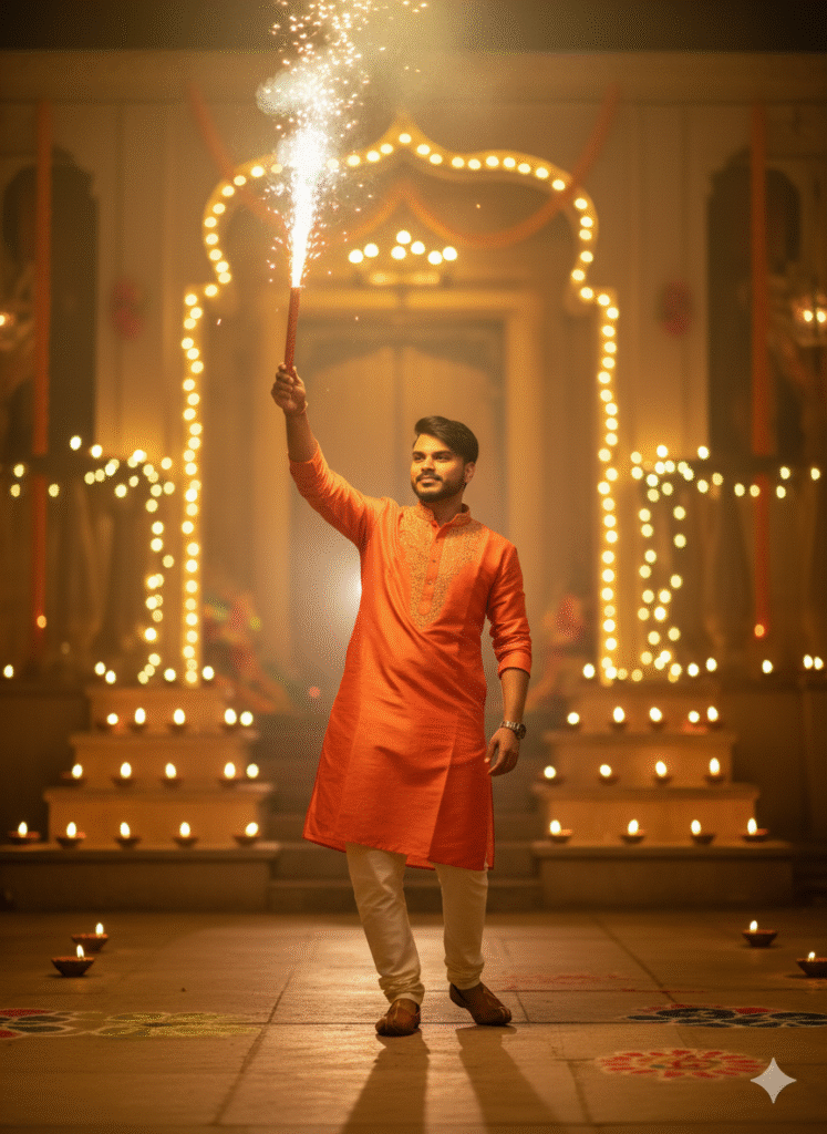 - Example: “boy in kurta, holding diya, soft background, cinematic lighting”