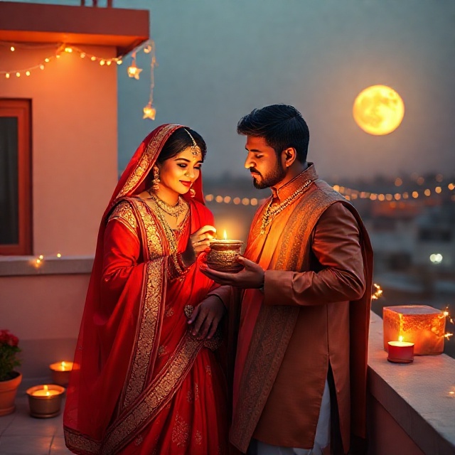 “Beautiful Indian couple celebrating Karwa Chauth on a rooftop, the woman dressed in a red lehenga with jewelry and sindoor, holding a decorated Karwa pot, while her husband lovingly offers her water after moonrise, surrounded by candles, fairy lights, and a big glowing moon – photorealistic, high detail, festival atmosphere – Karwa Chauth AI image.”