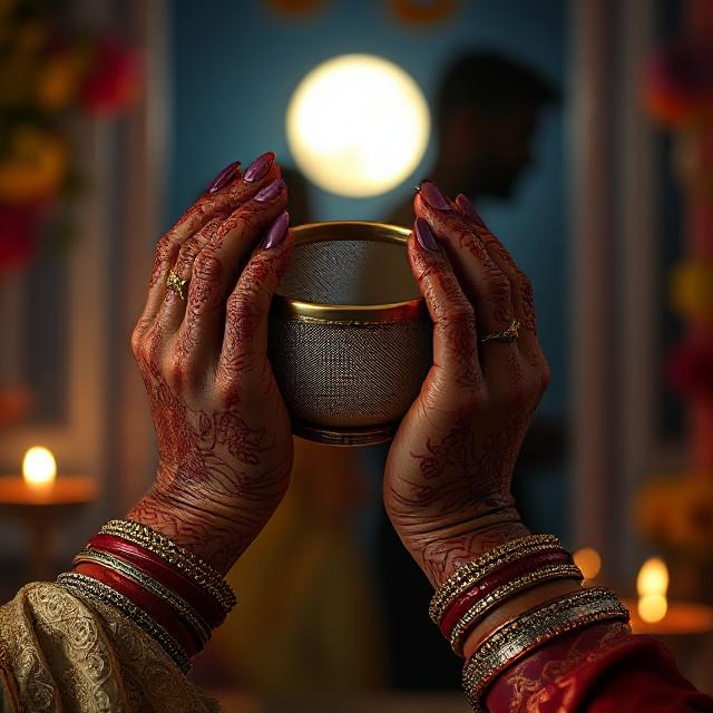 “Close-up of Indian woman’s mehndi hands holding a sieve, moon shining through it, blurred silhouette of her husband in background, festival decorations with flowers and diyas, photorealistic, cinematic focus, deep emotions – Karwa Chauth AI image.”