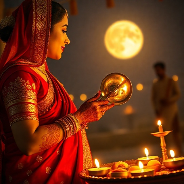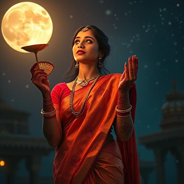 “An Indian married woman wearing a traditional red saree with golden embroidery, hands decorated with mehndi, holding a silver sieve (channi) while looking at the full moon on Karwa Chauth night, with glowing diyas, a decorated thali with sweets, and a romantic background of her husband standing beside her – ultra-realistic, cinematic lighting, festive vibes – Karwa Chauth AI image.”